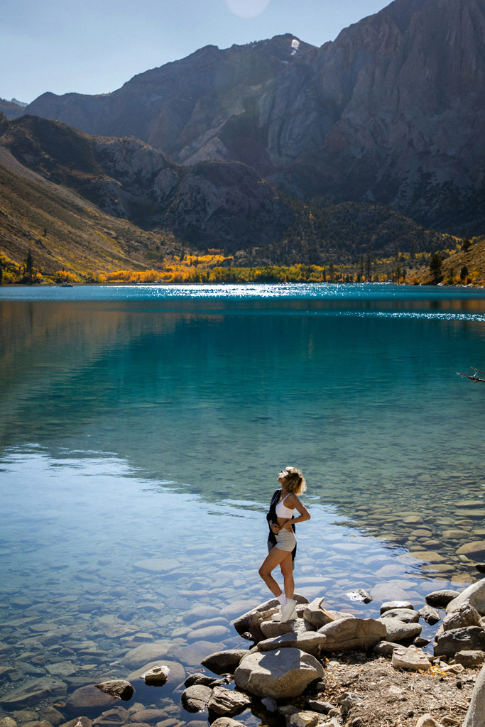 a stunning, deep alpine lake in California's Eastern Sierra Nevada, known for its brilliant turquoise water and dramatic backdrop of towering